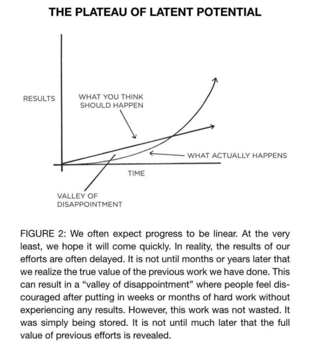 I’ve been thinking a lot about the plateau of latent potential this week. The concept here being that we often think our hard work should directly correlate with results in a linear way. But often times the reality is that we consistently spend hours working hard towards goals without seeing any results. This can lead to discouragement and many people throw in the eucalyptus towel and give up. But the difference between those who find astronomical success and those who don’t is simply staying the course. Our efforts will eventually compound, and the results will scale exponentially when we think we’ve exhausted our energy.