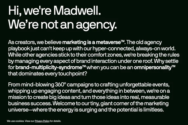 Creative agencies want you to think they aren’t an agency. More and more agencies are trying to ditch their traditional label, in order to communicate they are different. Think of all the agency websites that begin with the headline “We’re not an agency” Now these shops are rebranding as ‘creative consultancies’ or as a ‘creative solutions and innovation company’ Does it really matter what you call yourself as long as you’re creating great work for brands?